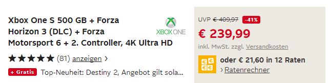 Bei OTTO erhaltet ihr momentan eine Xbox One S 500 GB mit einem 2. Controller und den Spielen Destiny 2, Forza Horizon 3 (DLC) und Forza Motorsport 6 für 239,99€ inkl. Versand.